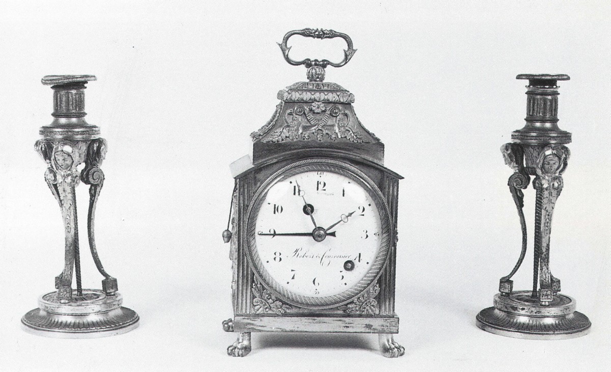 PENDULE de carrosse en bronze ciselé et doré. Ornée d'une prise de main à dauphins, et décorée sur le dessus à doucine de couronnes de laurier, de cornes d'abondance et de feuillages, et sur les côtés d'attributs de la musique. Elle repose sur quatre pieds griffe. Mécanisme d'horlogerie à répétition et formant réveil. Cadran signé ROBERT & COURVOISIER. Époque Louis XVI.