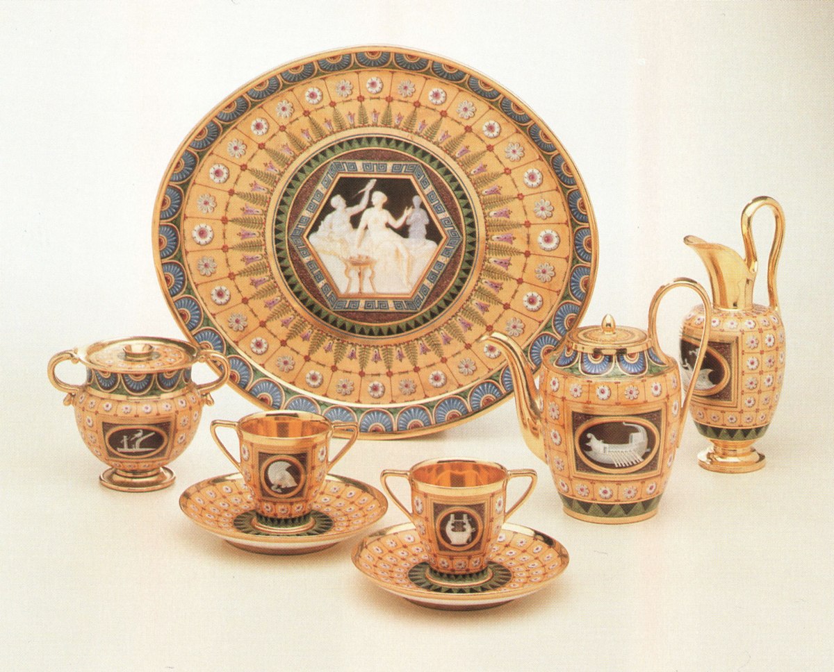 L'ensemble du "Déjeuner imitation de mosaïque florentine par Haurt camées etc." entra au magasin de vente le 22 décembre 1814 (Ibidem, registre Vv1, folio 29 n° w2). il comportait: un plateau ovale 2e grandeur, une théière Pestum, un pot à lait étrusque à bec, un pot à sucre étrusque, deux tasses et soucoupes étrusques et une boîte pour le tout, l'ensemble était évalué à 2 000 francs.