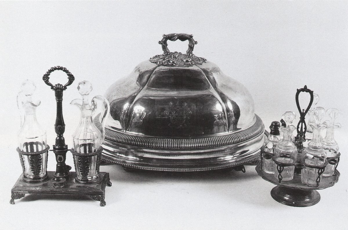 HUILIER-VINAIGRIER en argent sur une base rectangulaire à doucine reposant sur quatre pieds griffe ornés d'une tête de lion et de feuillages, les réceptacles sont composés de grandes plumes et de palmes, le manche de forme balustre à décor de feuilles d'acanthe est orné d'armoiries encadrées par deux licornes, et l'anse est composée de deux cornes d'abondance reliées par une alternance de boules et de disques. Flacons en cristal taillé. Époque Restauration. Poinçon VIEILLARD (1819-1838). Grosse garantie Paris.