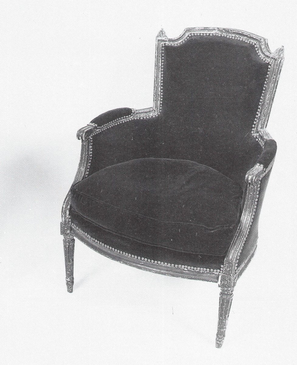 BERGÈRE à dossier cabriolet à chapeau de gendarme, en bois anciennement laqué, piétement à cannelures. Époque Louis XVI.