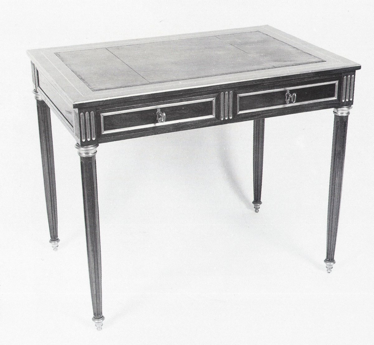 TABLE-BUREAU en acajou et placage d'acajou toutes faces reposant sur quatre pieds cannelés. Elle ouvre à deux tiroirs. Belle ornementation de baguettes et de joncs en cuivre doré. Époque Louis XVI.