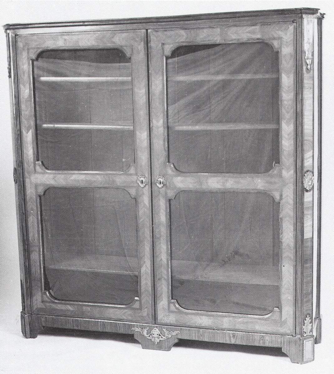 Grande et belle BIBLIOTHÈQUE en bois de placage de satiné en aile de papillon et filets de bois de violette. Montants à pan ornés de bronzes en applique. Elle ouvre à deux vantaux à quatre panneaux vitrés. Époque Louis XVI.
