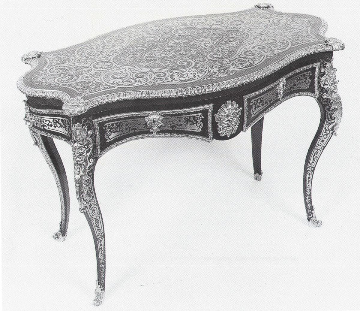TABLE DE MILIEU de forme mouvementée en bois noirci marqueté toutes faces d'écaille brune et de cuivre dans le goût de Boulle. Belle ornementation de bronzes dorés: ceinture, écoinçons, chutes, sabots à décor iconographique du XVIIIème. Elle ouvre à deux tiroirs en façade. Le plateau dissimule un dessus de cuir gaufré, et se retourne pour présenter un décor de filets et de cuir ouvragé. Cette table de milieu fait donc office de table de salon, table à jeu et bureau. Style Louis XV-Régence. Époque Napoléon III.
