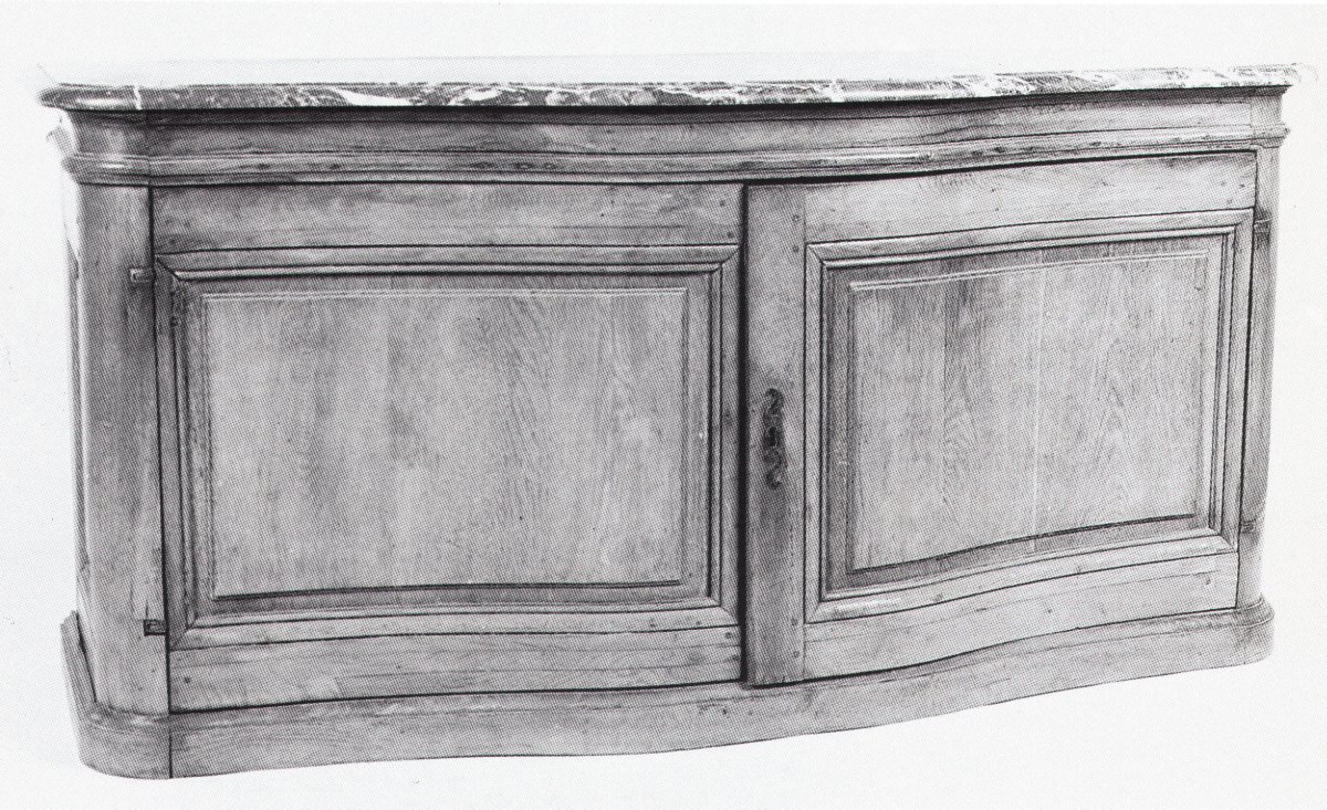 BUFFET DE CHASSE en bois naturel à façade galbée ouvrant à deux vantaux moulurés. Dessus de marbre brocatelle à bec de corbin. Époque Louis XV.