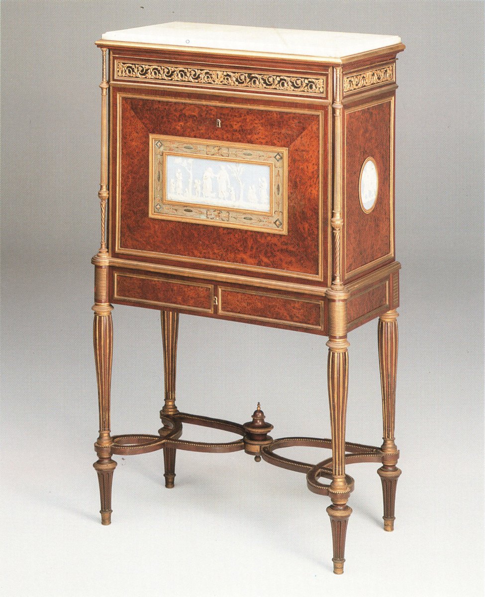 Certains meubles exécutés par Weisweiler présentent des plaques de Wedgwood semblables à la plaque centrale de notre secrétaire (nymphes, Cupidon, enfants). Cette plaque a été dessinée par Lady Templeton sur le sujet suivant: an offering to peace, december 1777. La nymphe en train de sacrifier sur la droite a été remplacée par un personnage de la série Domestic Employement. Référence: A. Kelly "Decorative Wedgwood", Londres 1965.