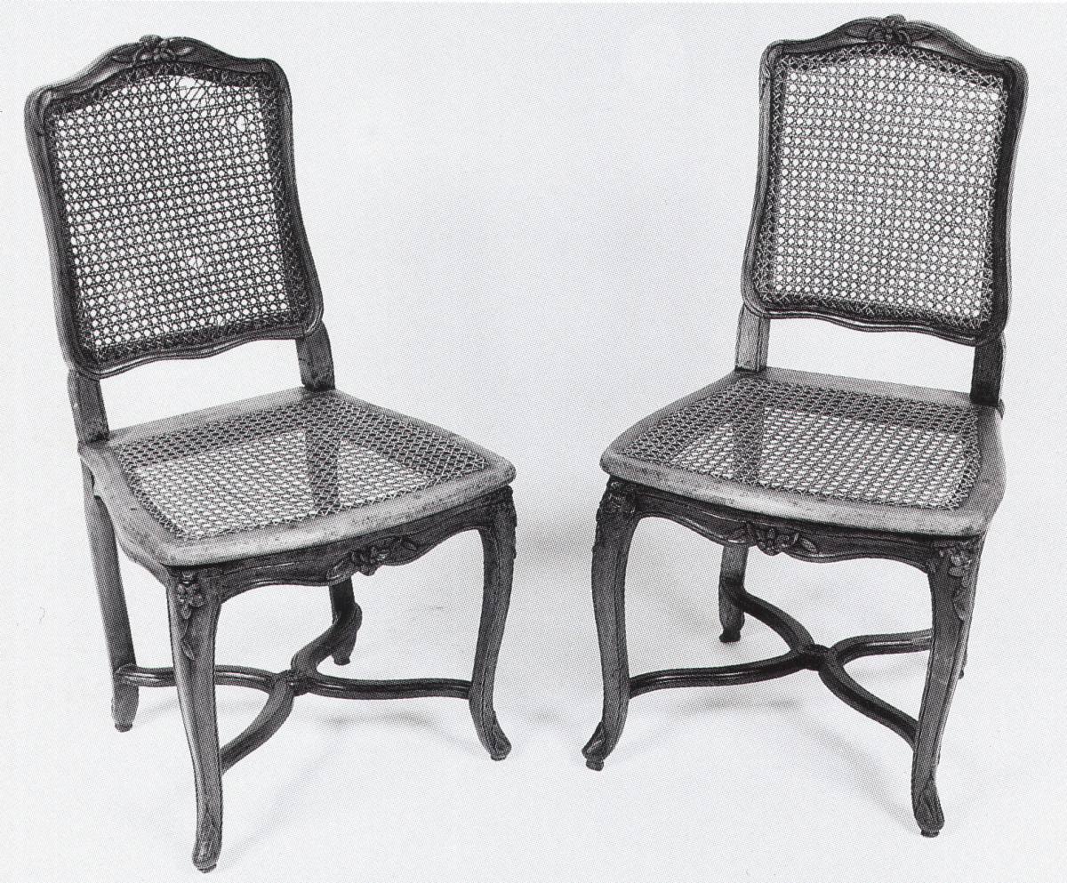 PAIRE DE CHAISES en bois naturel mouluré et sculpté de fleurettes. Fonds cannés. (entretoise refaite). Estampillées C. LEBESQUE JME. Époque Louis XV. Claude Pierre LEBESQUE, reçu Maître le 6 mai 1750.