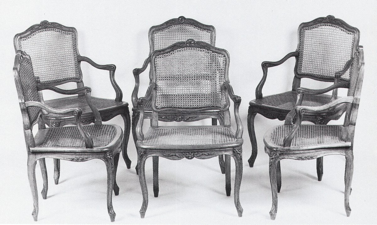 Réunion de SIX FAUTEUILS à dossier plat en bois naturel, mouluré et sculpté de fleurettes. Fonds cannés. Époque Louis XV. (restaurations, légères différences).