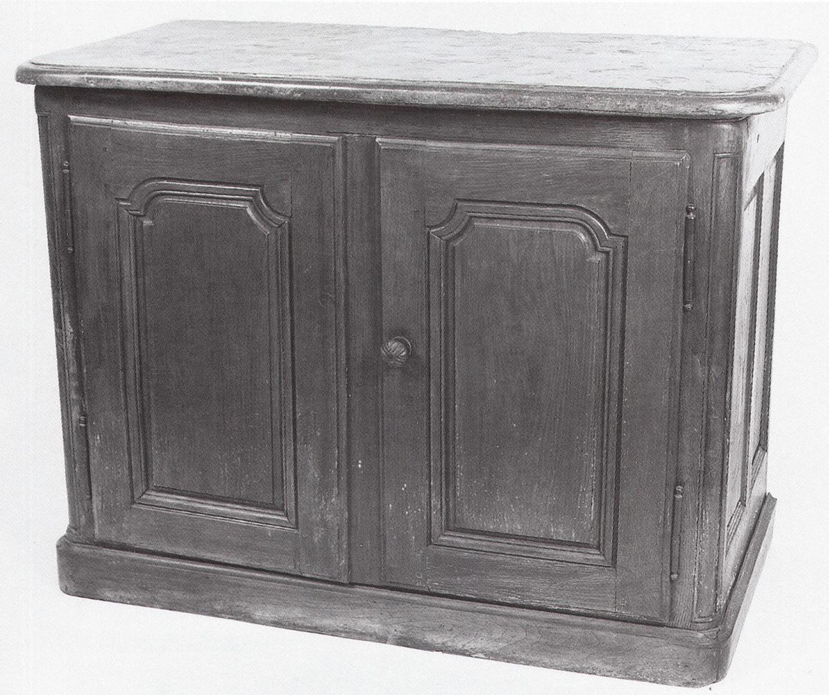 BUFFET DE CHASSE en bois naturel ouvrant à deux vantaux, à riches moulures. Dessus de marbre gris. Estampillé ROUSSEL. Époque Louis XV, début XVIIIème. Famille d'ébénistes et de menuisiers à partir de la Régence, A. ROUSSEL fut ébéniste du Roi sous la Régence.