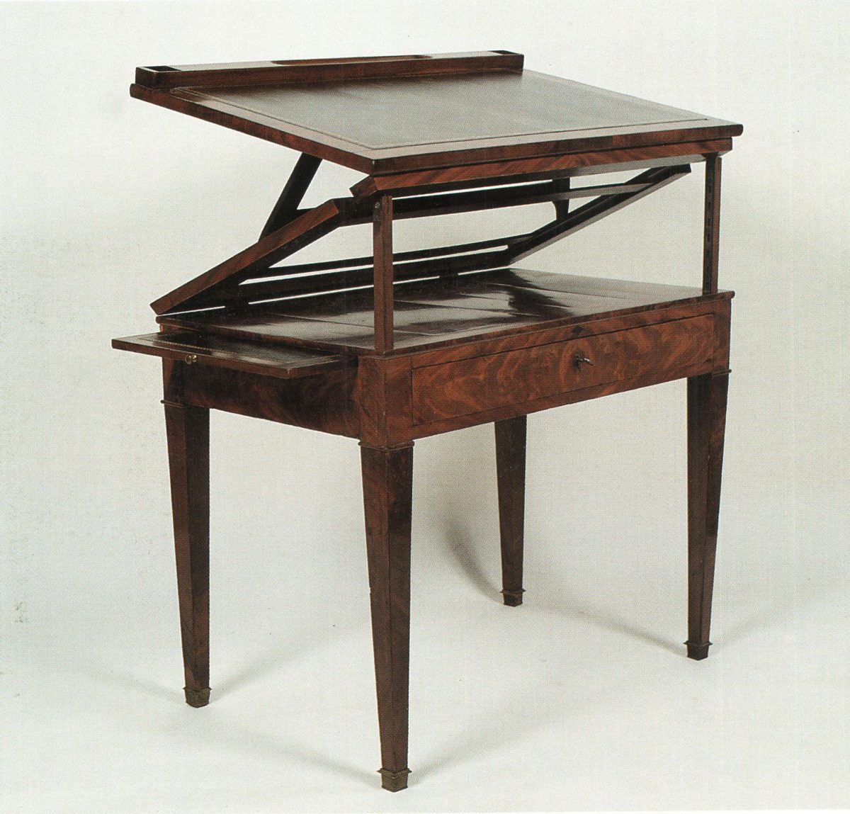 TABLE dite à la Tronchin en acajou flammé de Cuba, reposant sur quatre pieds gaines. Elle ouvre à un tiroir en façade dissimulant un casier à godets, et deux tirettes latérales. Système à mécanisme des plateaux. Époque Empire, début XIXème. (godet, plumier postérieur).