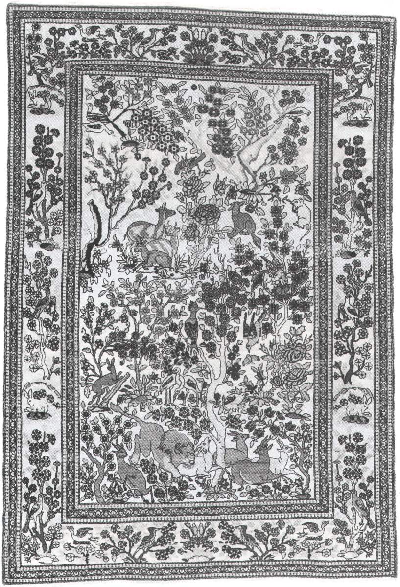TAPIS ISPAHAN, persan, début de siècle, fond ivoire à décor d'arbre de vie, enrichi de volatiles et d'animaux sauvages. Belle bordure ivoire à arbustes fleuris et volatiles.