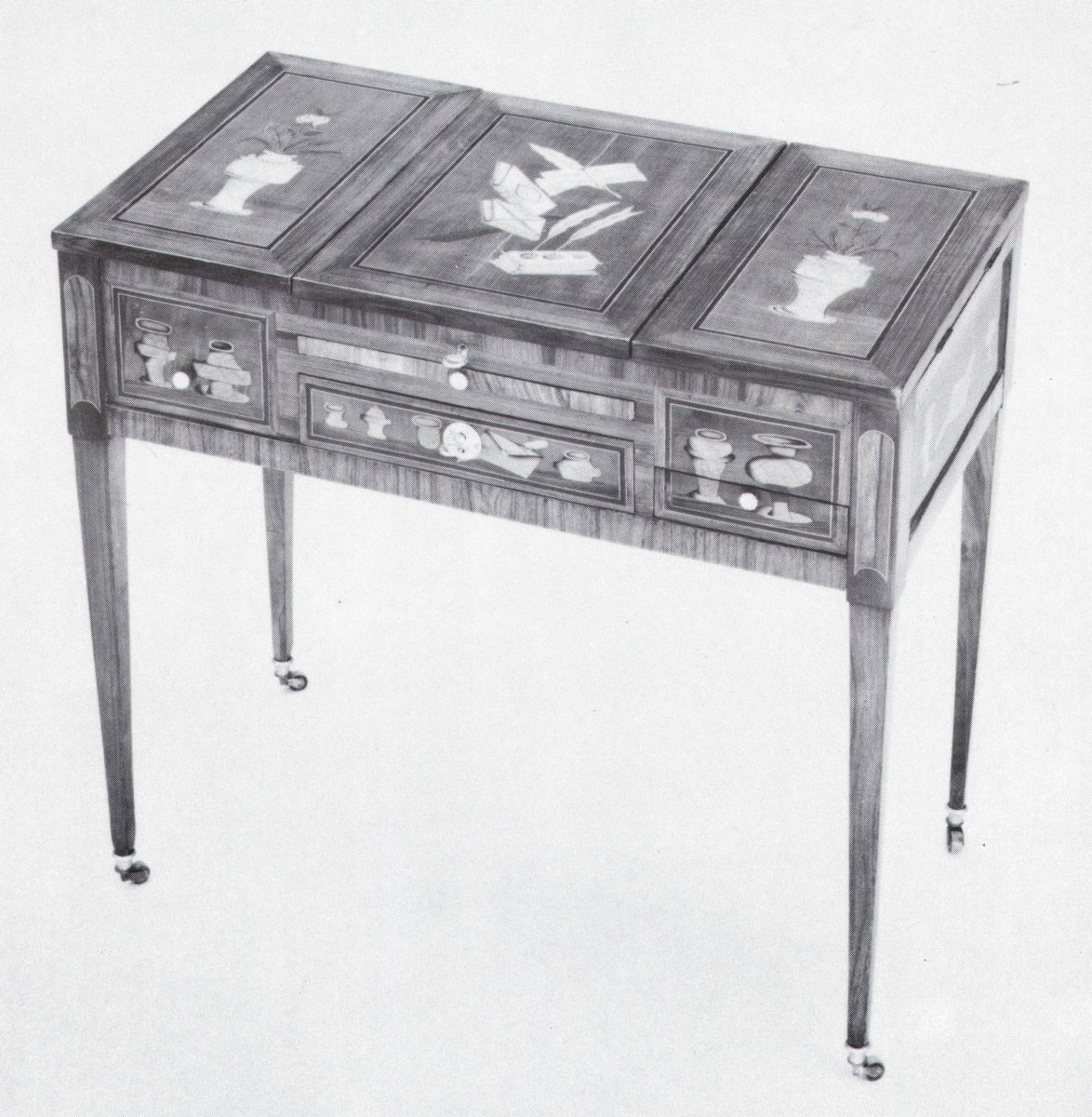 Marqueterie aux objets domestiques dans le genre de TOPINO (reçu maître en 1773) s'inspirant des bordures de paravent chinois en laque de Coromandel.