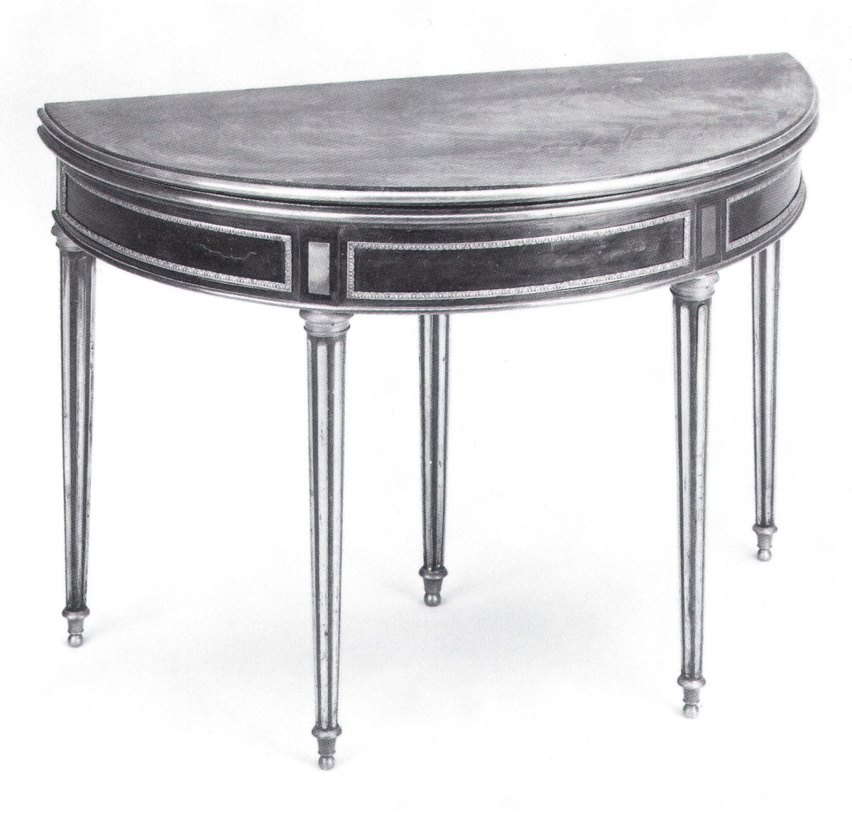 TABLE BOUILLOTTE BRISÉE, dite table demi-lune en acajou et placage d'acajou. Ornementation en laiton: cannelures, joncs, plaques, sabots, bagues, raies de cœur. Le plateau semi-circulaire devenant circulaire. Elle repose sur 5 pieds à cannelures.