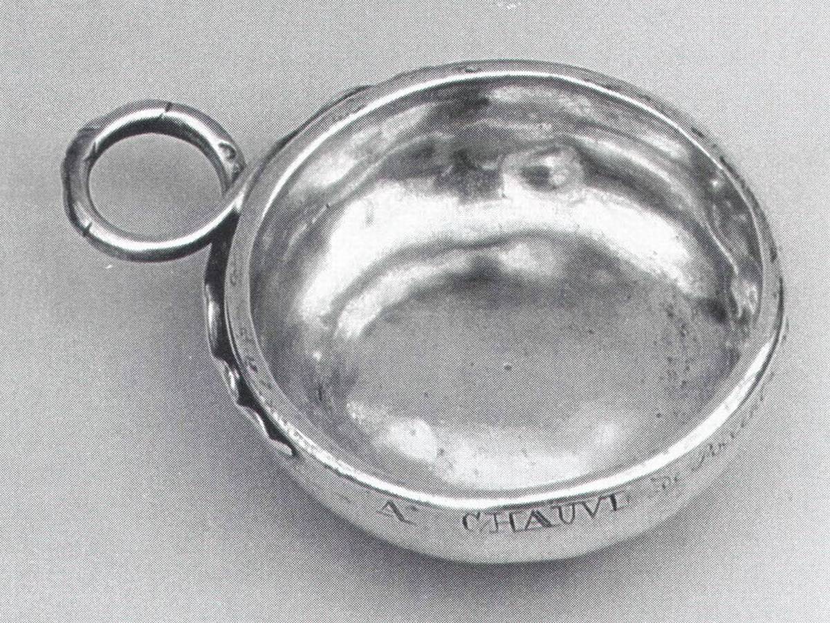 TASTEVIN en argent uni, à anse serpent formée de deux têtes affrontées, sous le bord, gravé « A. Chauve de Parent M. ».