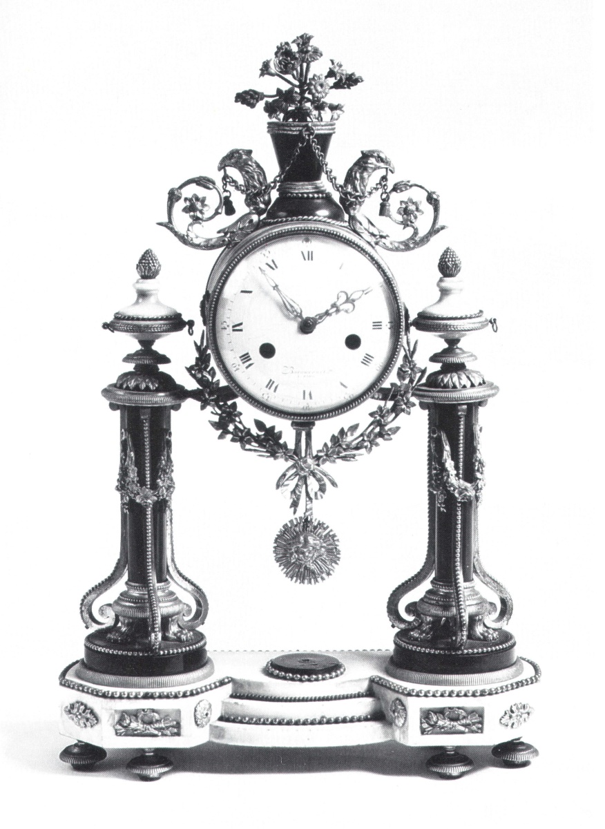 PENDULE portique, le cadran signé de BARANCOURT à Paris, en marbre noir, marbre blanc et bronze ciselé et doré, à décor de têtes d'aigle, guirlandes de fleurs, vases simulés, bouquets de fleurs. Consoles à griffes de lion. Socle à marches et petits pieds.