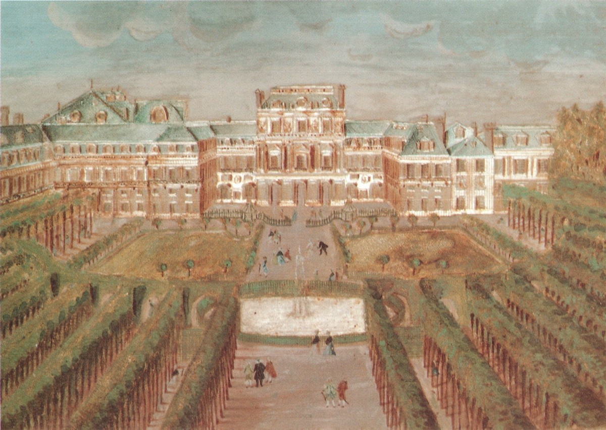 Vue du Palais-Royal: Ce sujet fut plusieurs fois traité par Compigné. Un sujet identique est conservé dans une grande collection française. Le Musée de l'Ile-de-France au château de Sceaux conserve un guéridon ovale dont le plateau est orné d'un Compigné identique.