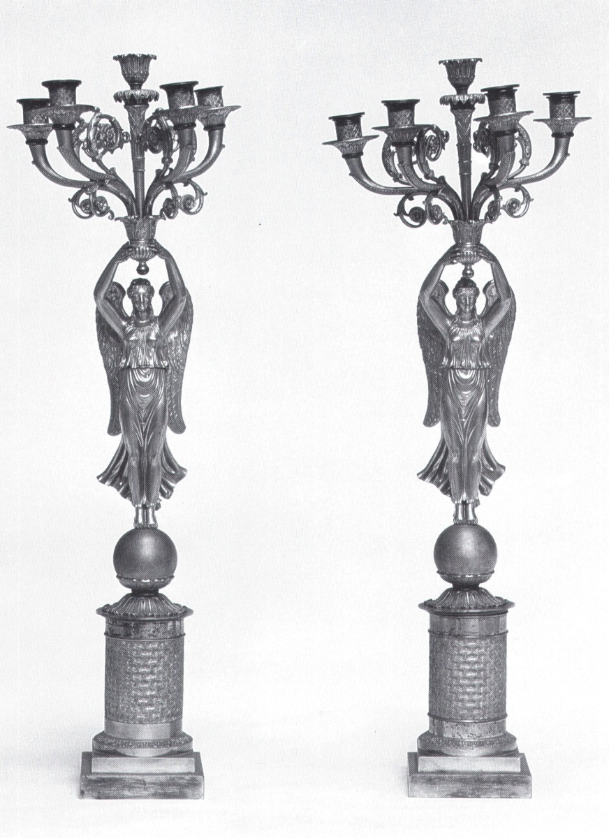 Belle PAIRE DE CANDÉLABRES à cinq lumières, en bronze ciselé et doré, les fûts formés de Renommées soutenant les bras à rinceaux, fleurettes et feuillages. Bases cylindriques à palmettes et fleurs.