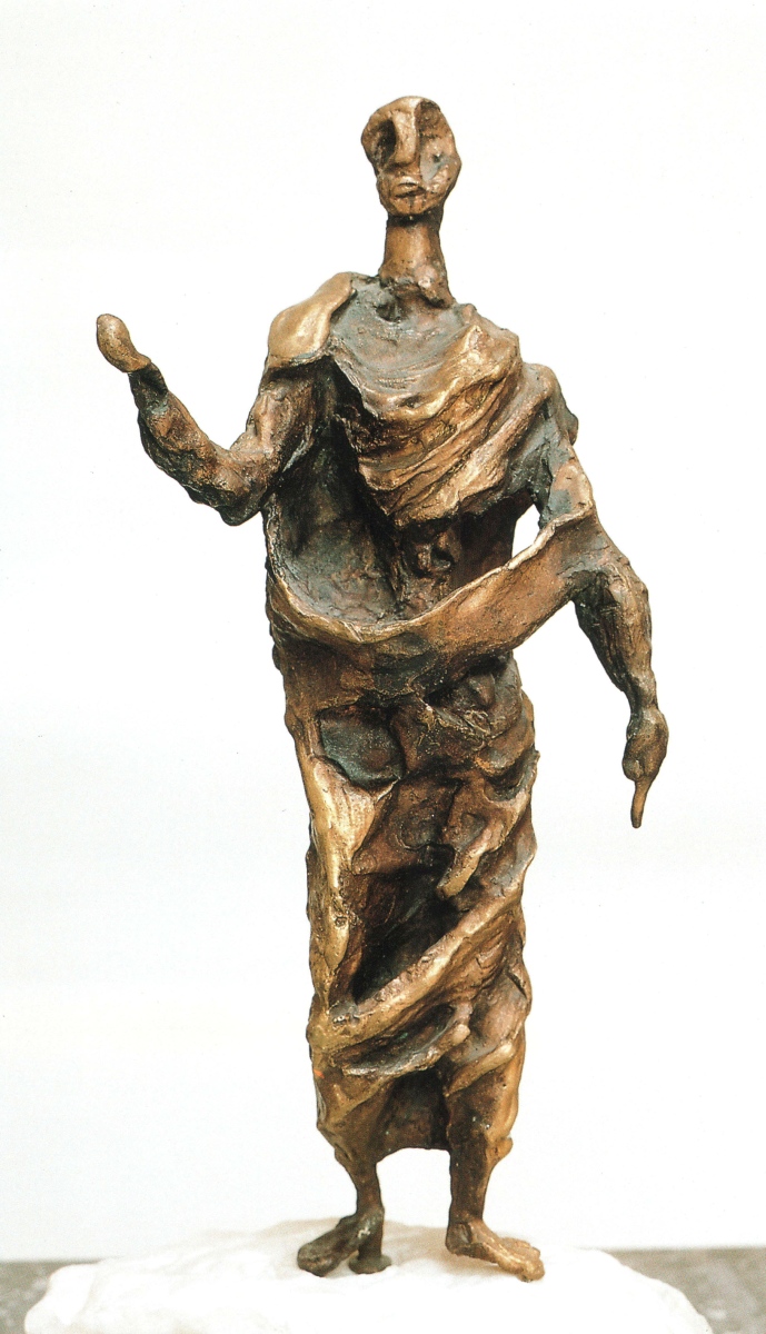 Bronze à deux patines, sur socle en marbre blanc en taille directe.