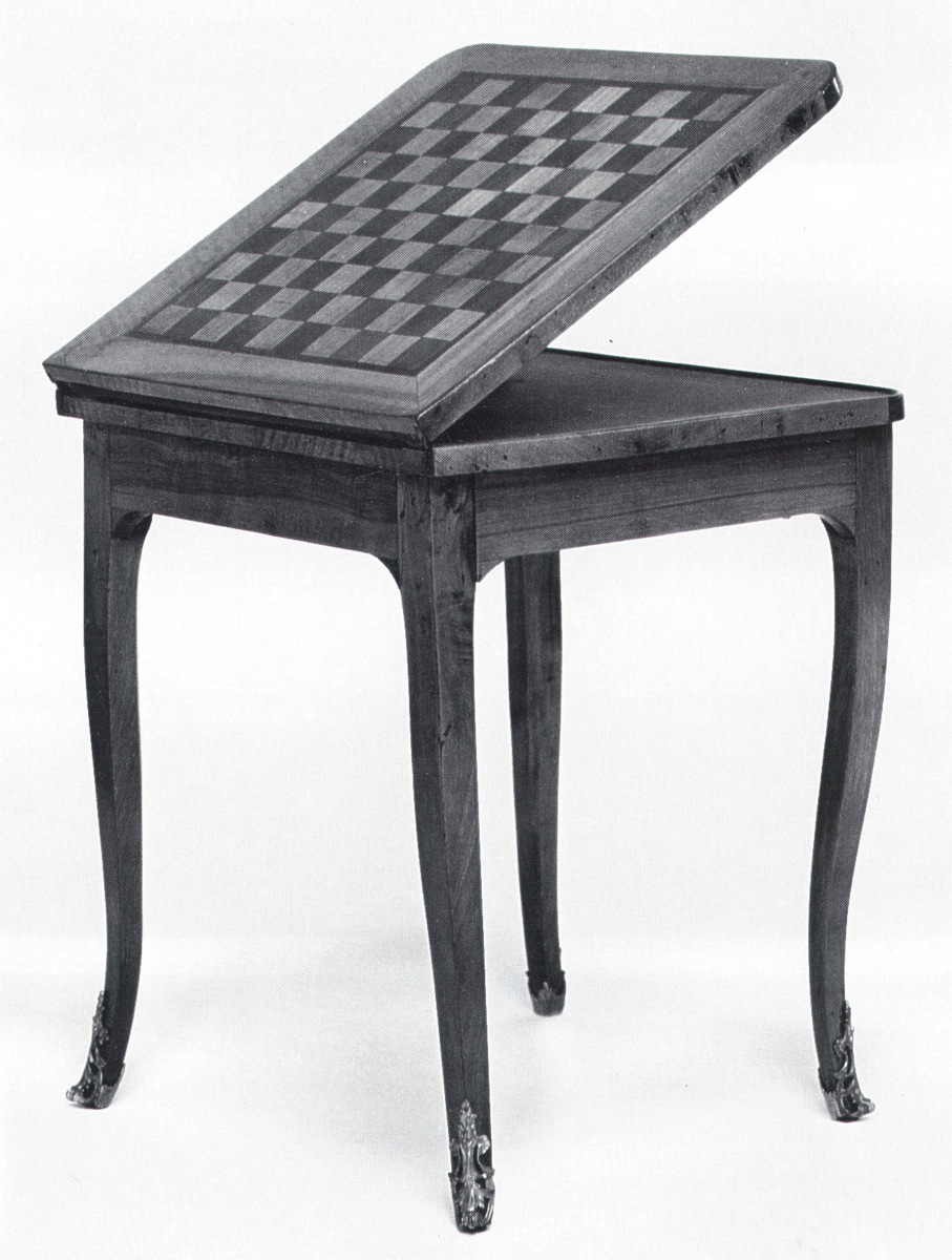 TABLE A JEUX, à plateau pliant, en bois naturel et palissandre. Dessus de plateau marqueté à damier. Intérieur garni de drap vert. Pieds légèrement cambrés à sabots de bronze.