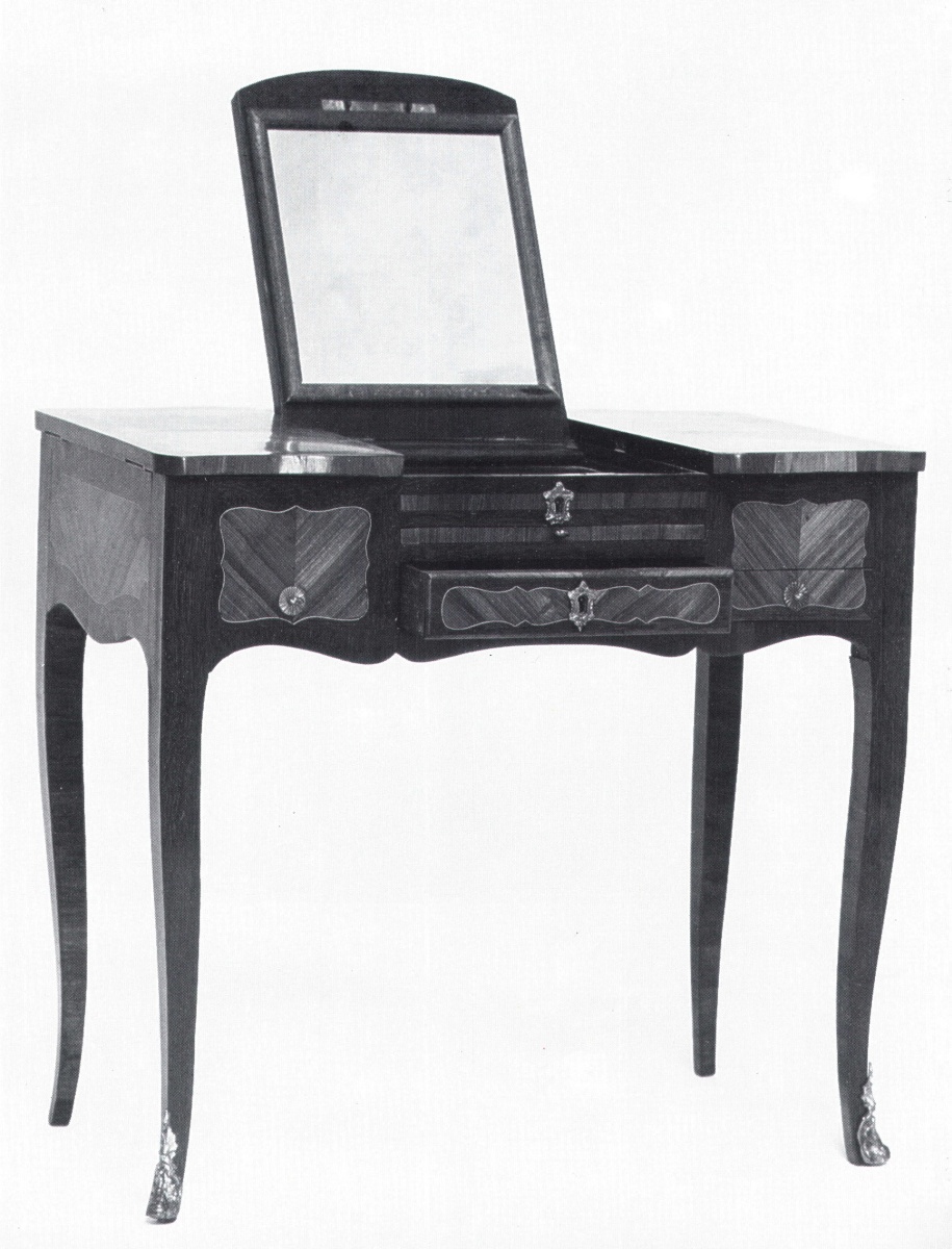 COIFFEUSE en placage de palissandre et bois de rose dans des encadrements de filets de bois clair. Elle ouvre sur le dessus par trois abattants dont un est foncé de glace et par deux tiroirs et une tirette en ceinture. Pieds cambrés. Ornementation de bronzes ciselés et dorés: entrées de serrure, boutons de tirage, et sabots.