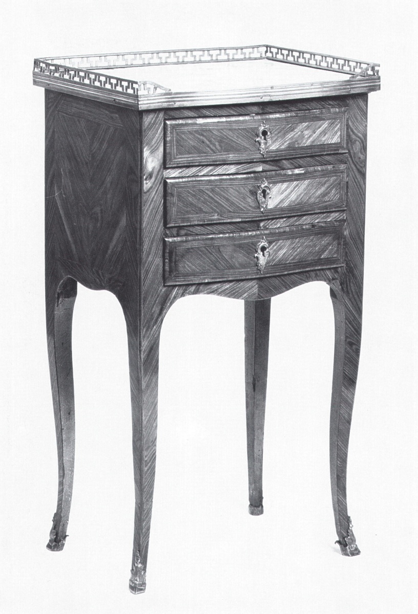 Petite TABLE à trois rangs de tiroirs, le premier formant écritoire, en bois de placage marqueté dans des encadrements. Pieds cambrés à sabots de bronze. Dessus de marbre brèche à galerie de bronze.