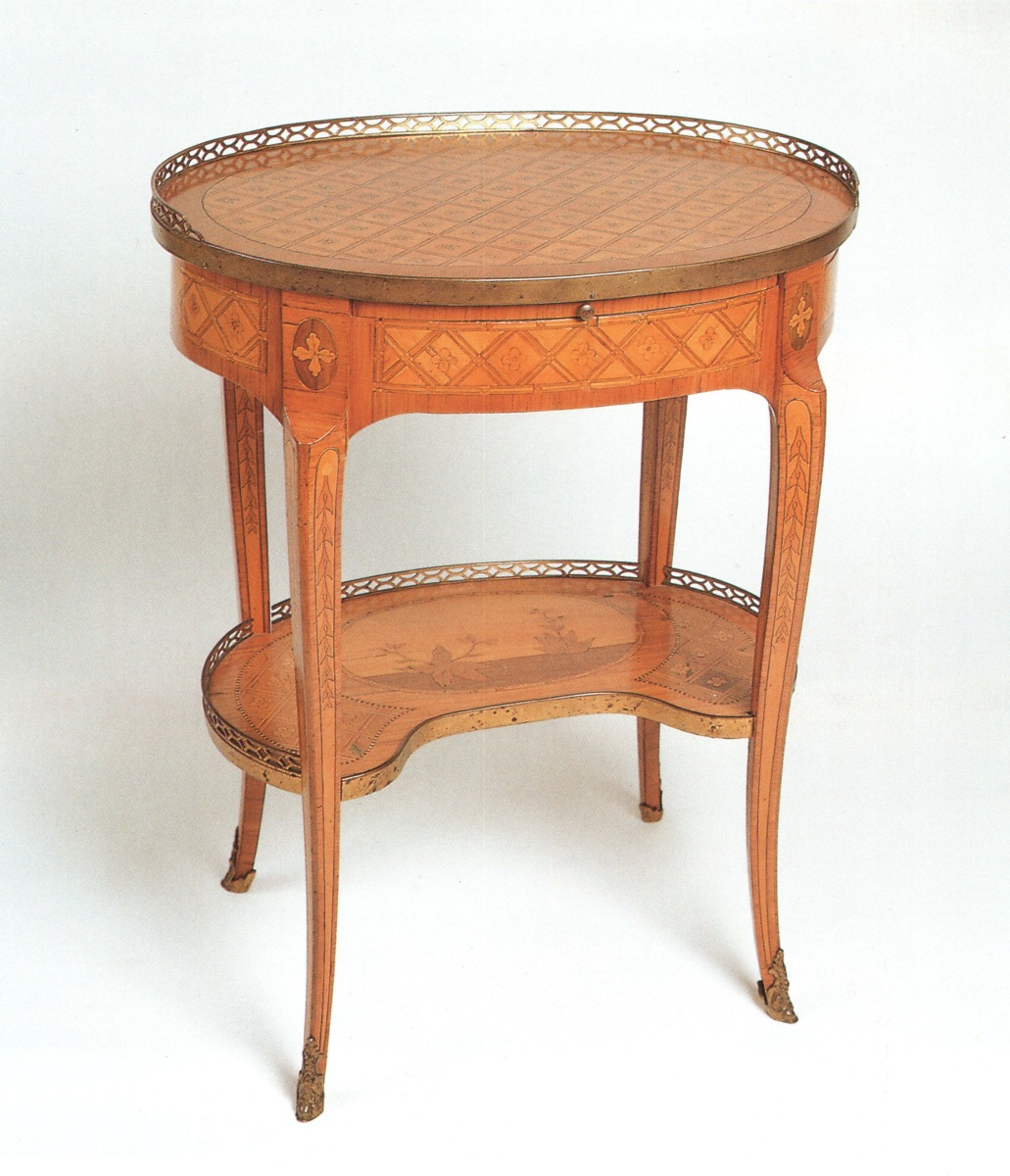 Belle petite TABLE DE SALON de forme ovale, à toutes faces, en bois de placage marqueté de quartefeuilles dans des quadrillages. Elle ouvre par un tiroir et une tablette en ceinture. Montants ornés de rosaces; pieds légèrement incurvés réunis par une tablette de forme rognon marquetée de feuillages, quartefeuilles et quadrillages, ceinturée d'une galerie de bronze ajouré. Ornementation de bronzes ciselés et dorés avec feuilles d'acanthe aux sabots et galerie ajourée ceinturant le plateau supérieur.