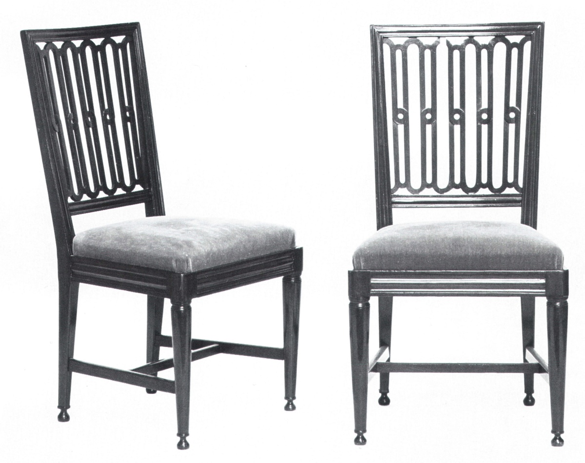 Curieuse PAIRE DE CHAISES en acajou et placage d'acajou à dossier plat ajouré à barrettes; ceinture moulurée. Pieds fuselés ou gaines réunis par une entretoise en H.