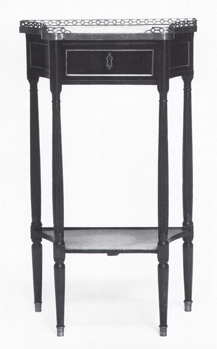 Petite CONSOLE à côtés évidés, en acajou et moulures de cuivre, un tiroir en ceinture, montants fuselés à cannelures; pieds fuselés réunis par une tablette. Dessus de marbre blanc veiné gris ceinturé d'une galerie de bronze ajouré.