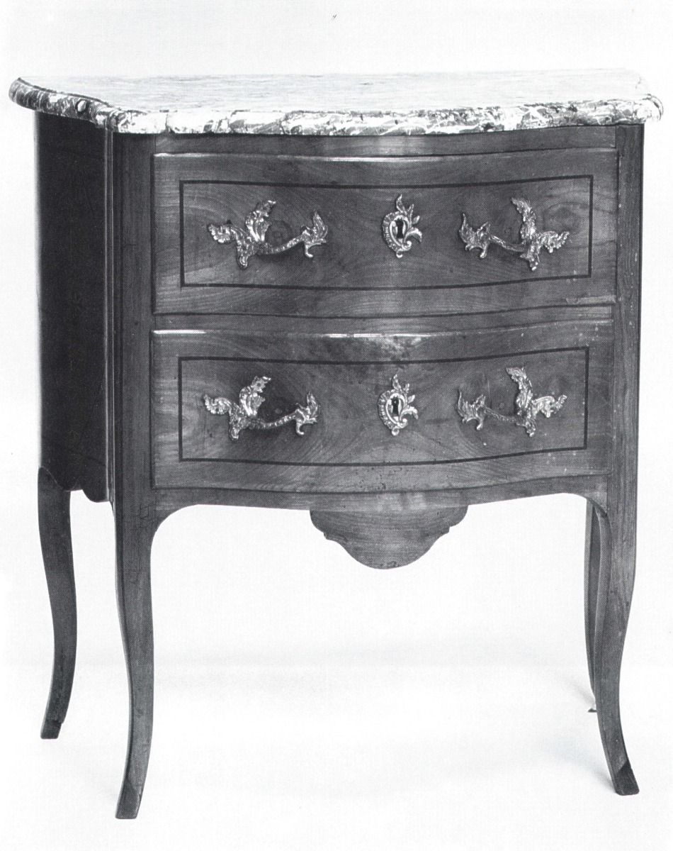 Petite COMMODE de forme galbée, ouvrant à deux tiroirs, en bois naturel et filets de marqueterie; pieds cambrés; montants arrondis. Ornementation de bronzes à entrées de serrure et poignées. Dessus de marbre brèche.