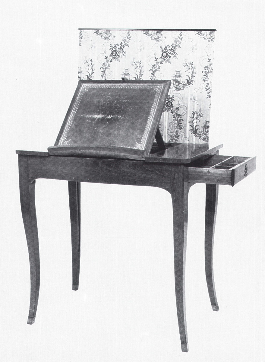 TABLE avec écran mobile en acajou, placage d'acajou et bois naturel; le plateau formant liseuse garni d'un cuir doré aux petits fers. Elle ouvre par un tiroir en ceinture avec petits casiers; pieds légèrement cambrés.
