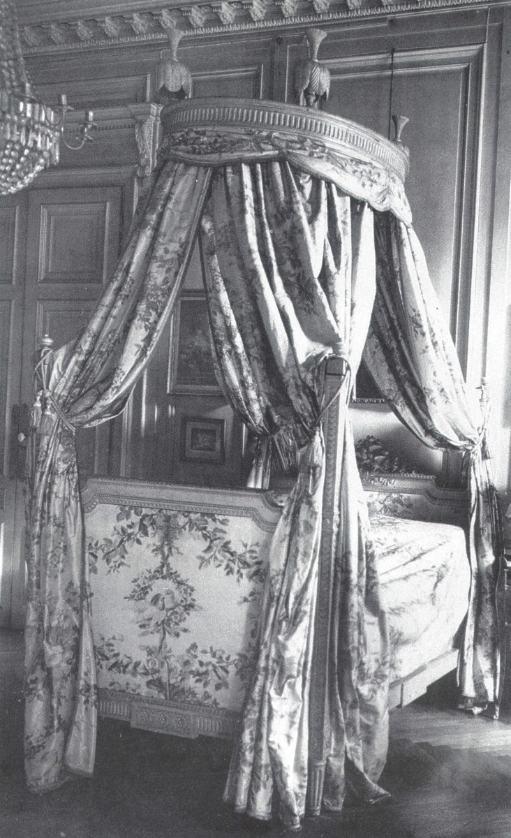 LIT A LA POLONAISE, en bois relaqué gris, mouluré et sculpté de fleurs, feuillages, piastres et rosaces. Le ciel de lit présente de grands panaches feuillagés.