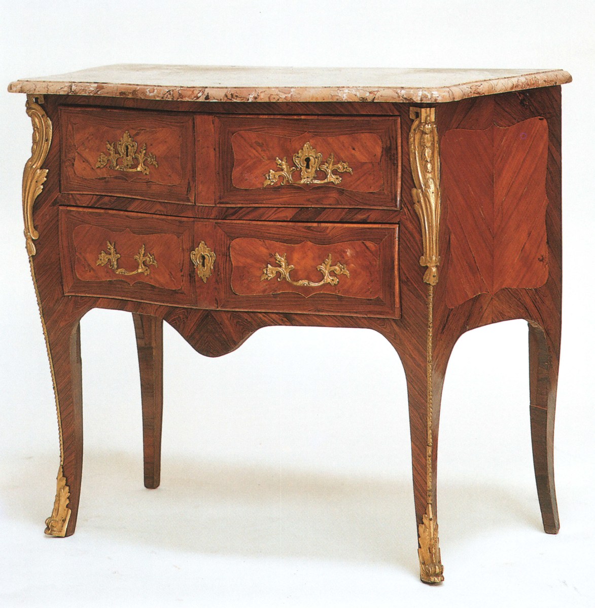 COMMODE galbée à deux rangs de tiroirs, le premier en deux parties, elle est en placage de bois de rose et de palissandre dans des encadrements à filets; pieds cambrés.