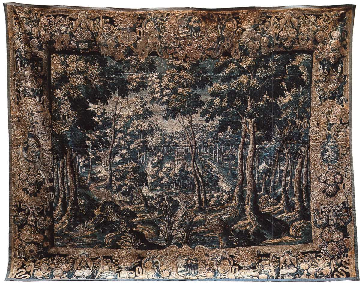 Belle TAPISSERIE DES FLANDRES à décor en camaïeu bleu, représentant un château ceinturé d'un cours d'eau avec une barque en premier plan, dans un entourage sylvestre. Bordure florale à fruits polychromes.