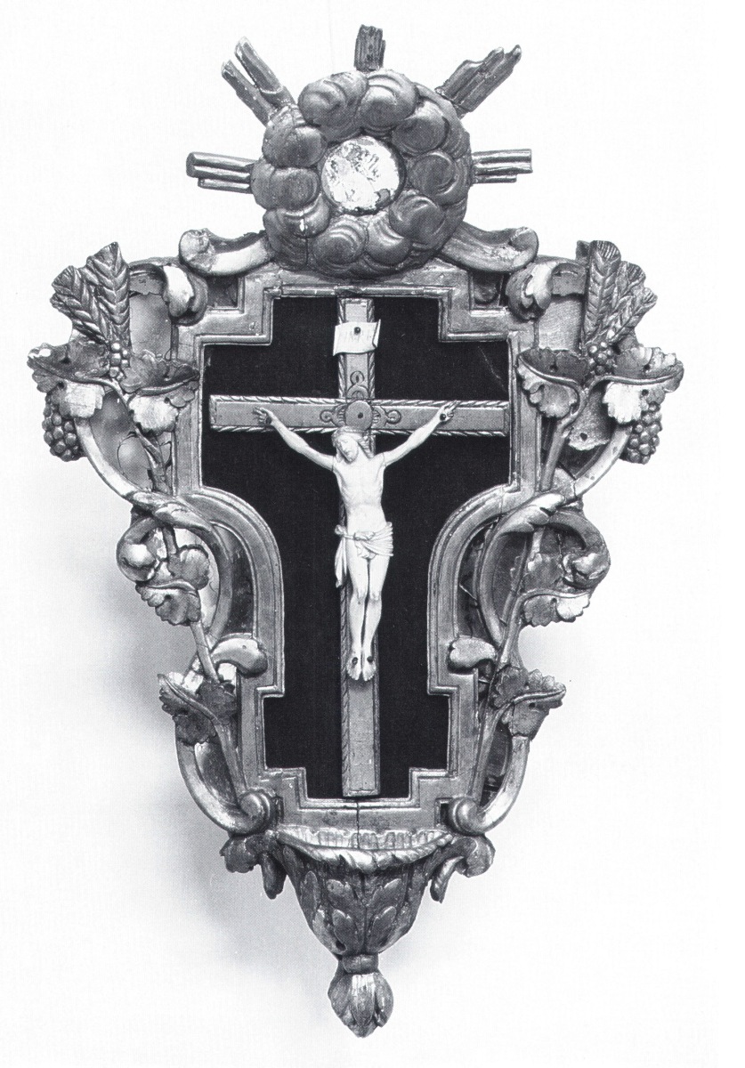 CHRIST en os dans un beau cadre en bois sculpté et doré, à décor d'épis de blé et pampre.