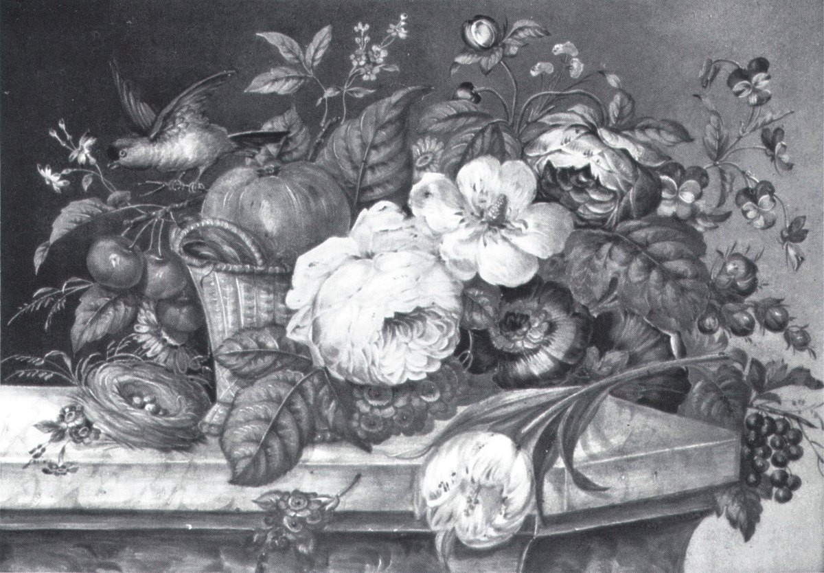 Grande PLAQUE en porcelaine du XIXe siècle, formant TABLEAU, représentant sur un entablement un nid avec des œufs, un oiseau et un panier chargé de fleurs et de feuillages. Cadre en bois doré et mouluré.
