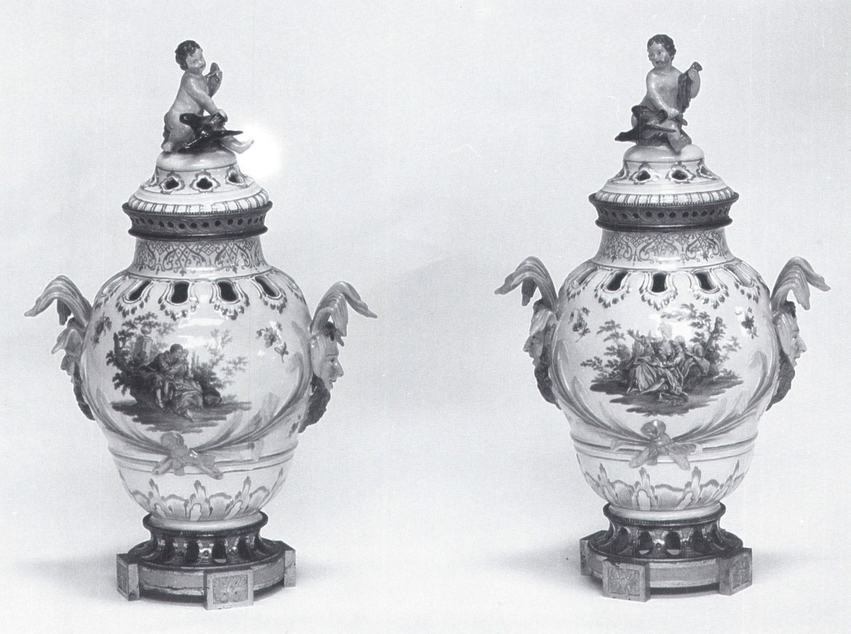ALLEMAGNE: PAIRE DE VASES formant pots-pourris en porcelaine polychrome et or à décor de personnages dans le goût de Watteau, masques d'hommes barbus, à roseaux et amours tenant des oiseaux aux prises des couvercles et aux feuillages. Monture de bronze à entrelacs.