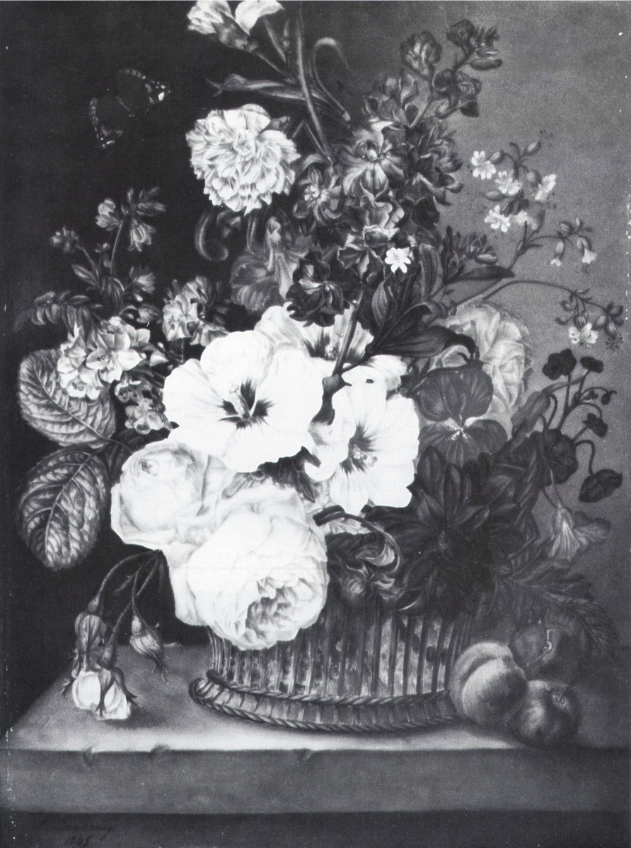 PLAQUE en porcelaine peinte à décor polychrome d'un bouquet de fleurs sur un entablement en pierre, avec panier de fruits et papillon. Cadre en bois doré mouluré. Signée: DENIANNAY, 1845.