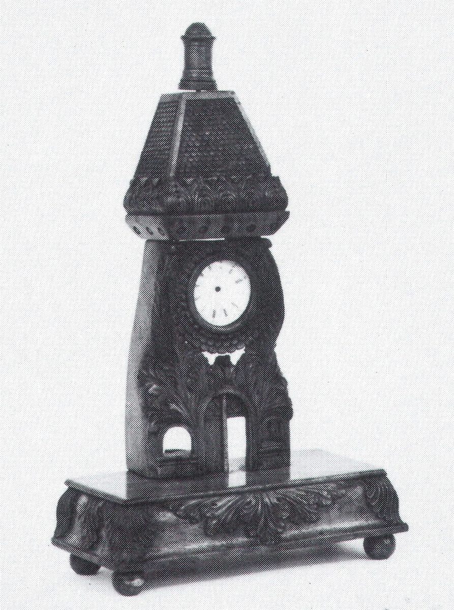 PORTE-MONTRE FORMANT COMTOISE, en noyer sculpté et ajouré suggérant une maison. Partie supérieure en forme de toit, tuiles et rang de palmettes sculptés, cheminée circulaire en ronde-bosse.