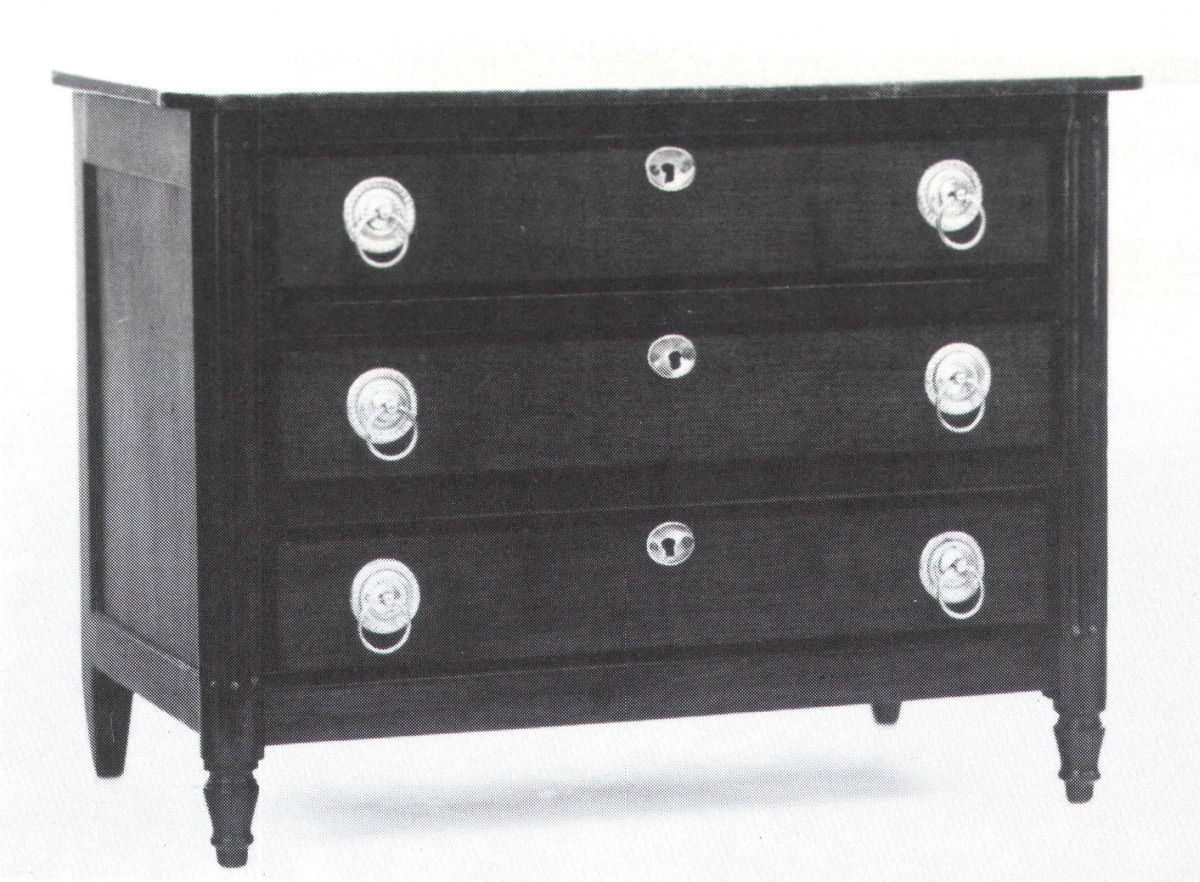 COMMODE en acajou ouvrant à trois rangs de tiroirs soulignés de filets élargis en placage d'ébène, anneaux de tiroirs dorés. Montants antérieurs arrondis et cannelés. Pieds en toupies.