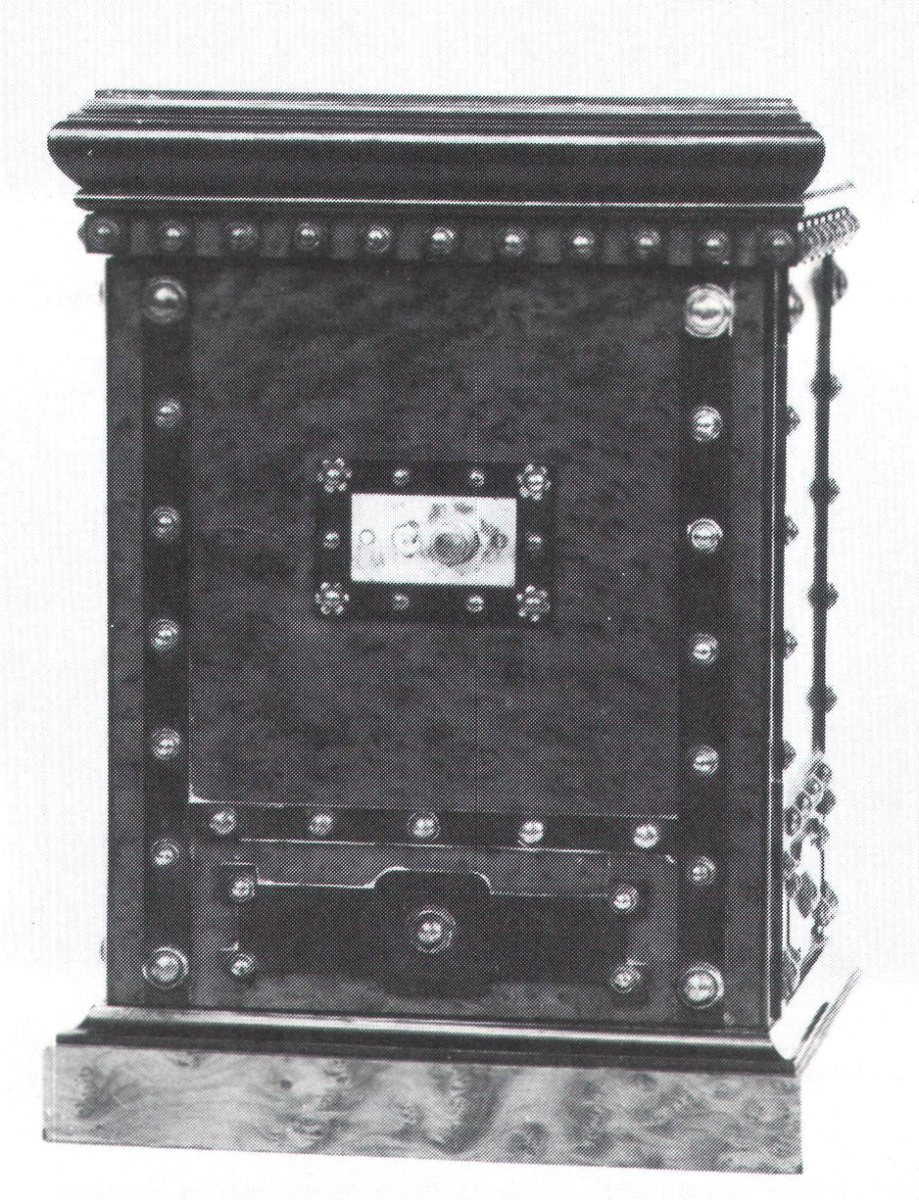 COFFRE-FORT en loupe de thuya ouvrant par le haut et la face, intérieur renfermant un tiroir en placage de palissandre. Corniche en bois noirci, base pleine. Décor de clous à tête ronde; boucles et cartouches de bois noirci ornant la corniche, la serrure et les faces du coffre.