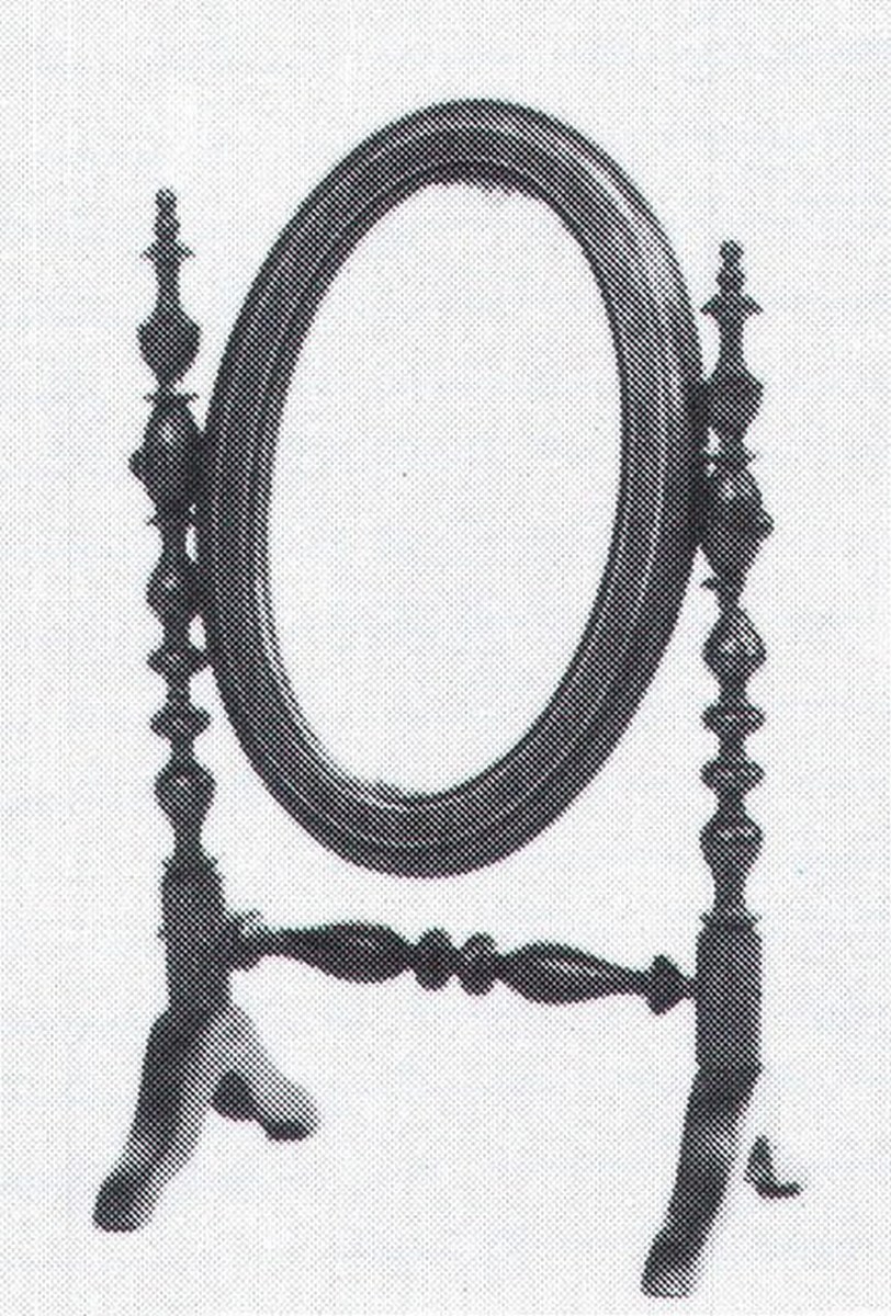 PSYCHÉ en palissandre, cadre ovale sculpté d'une pièce orné de trois filets marquetés de bois clair entourant le miroir. Montants et traverse tournés en balustres.