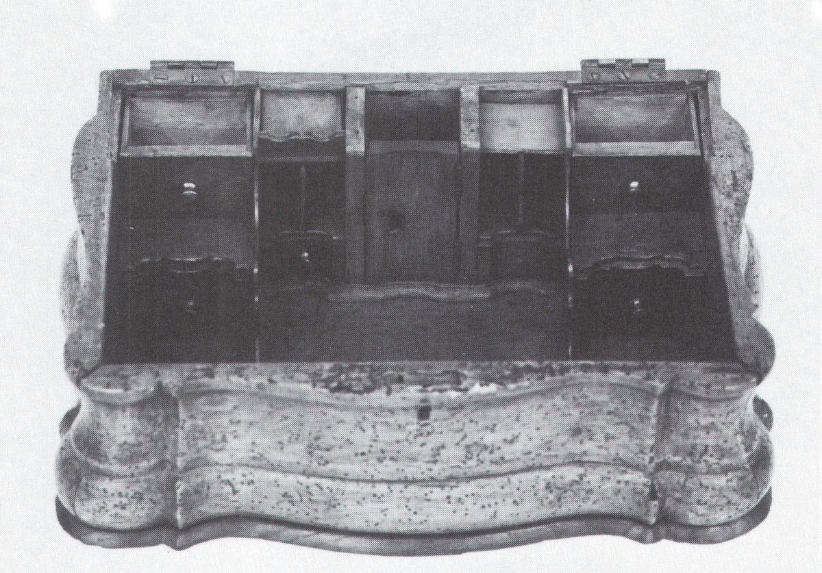 COFFRE en noyer aux formes mouvementées ouvrant à un couvercle par le haut, renfermant tiroirs, casiers, petit coffre central placés dans le fond sur deux rangées. La traverse médiane et la face des tiroirs inférieurs reprennent le mouvement de la forme extérieure.