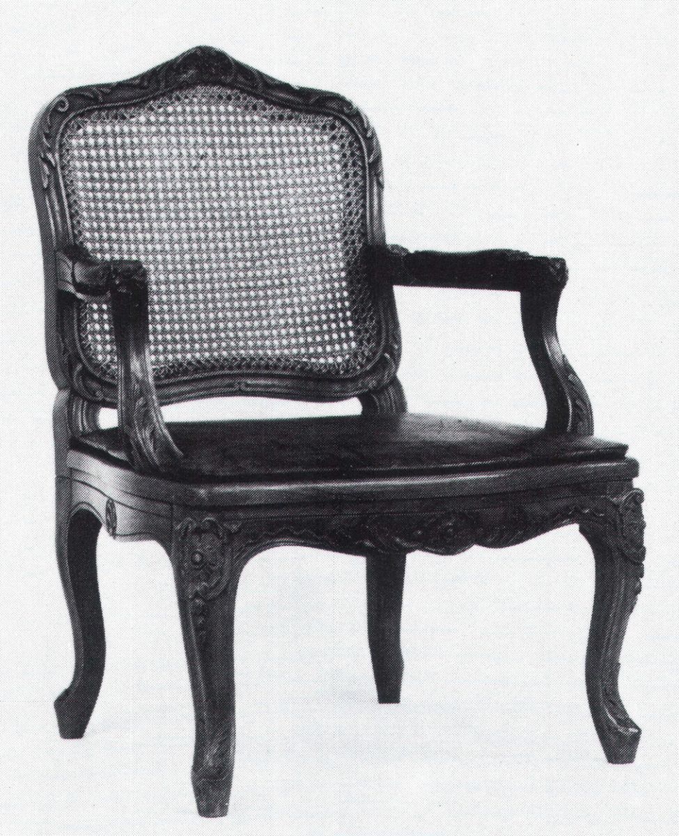 FAUTEUIL DE CABINET, dossier à la reine, en bois naturel mouluré, sculpté de fleurettes, feuillages. Pieds cambrés terminés par une palmette.