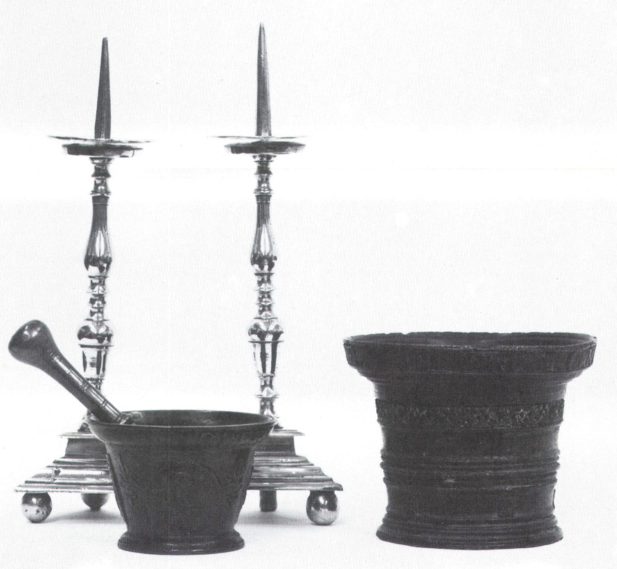 Rare MORTIER en bronze et son pilon décoré d'un médaillon représentant Louis XIII, inscrit LUD XIII D.G. FR. ET NAV. REX., et d'un médaillon représentant Marguerite d'Etampes. Deux autres médaillons à décor d'une joueuse de lyre et d'une joueuse de luth alternant avec de grandes fleurs de lis. Marqué sur le bord ANTHOINE IOBERT 1672.