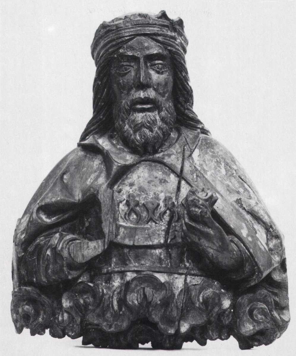 BUSTE en bois d'un personnage barbu et couronné (Dieu le père?) tenant dans ses mains une couronne.