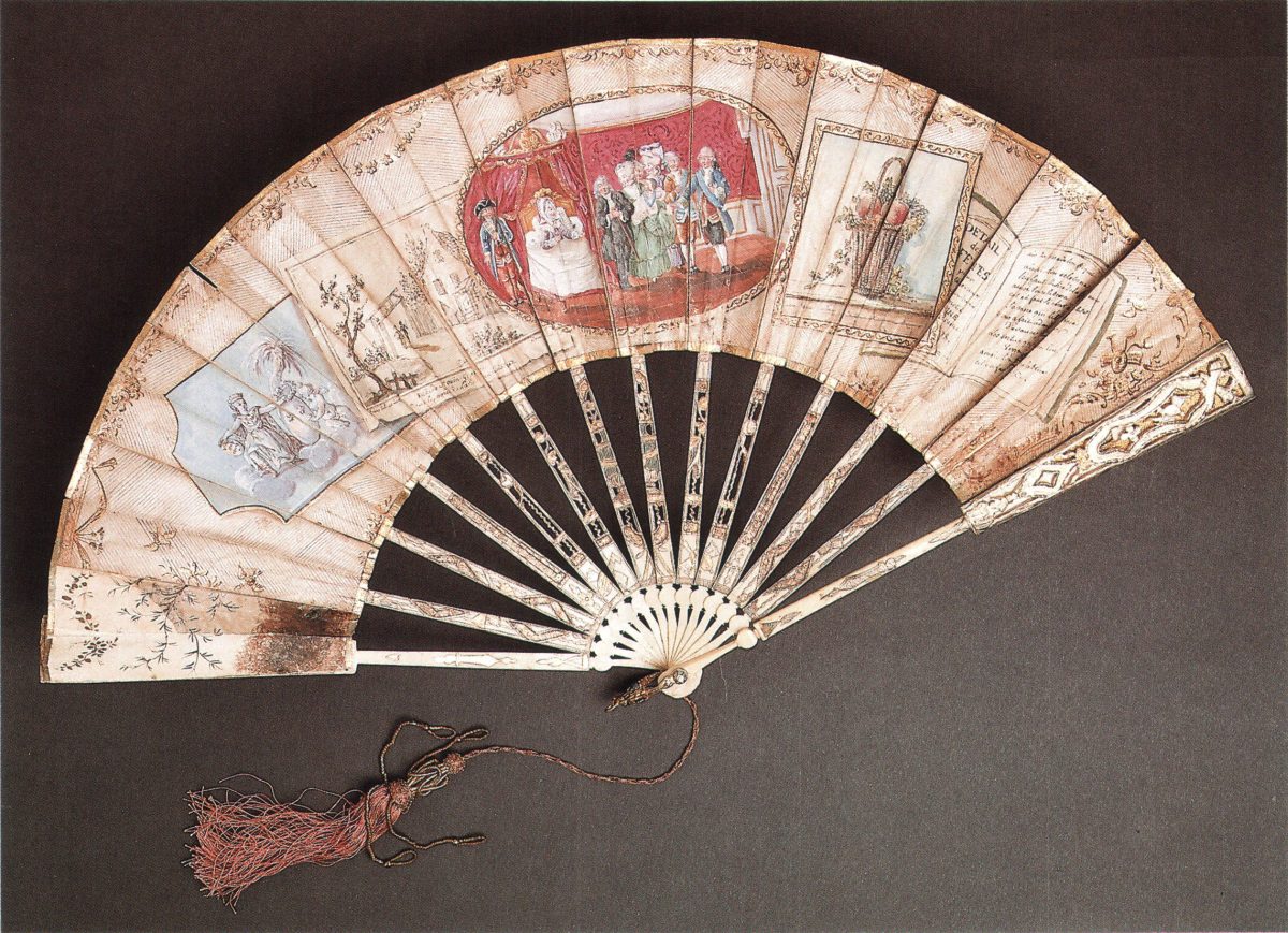 ÉVENTAIL dit à « double entente », monture ivoire repercé et or: naissance d'un enfant de France à Versailles, cartouche central avec allégories, détail des fêtes ― à la lucarne ― et décor au Chinois.