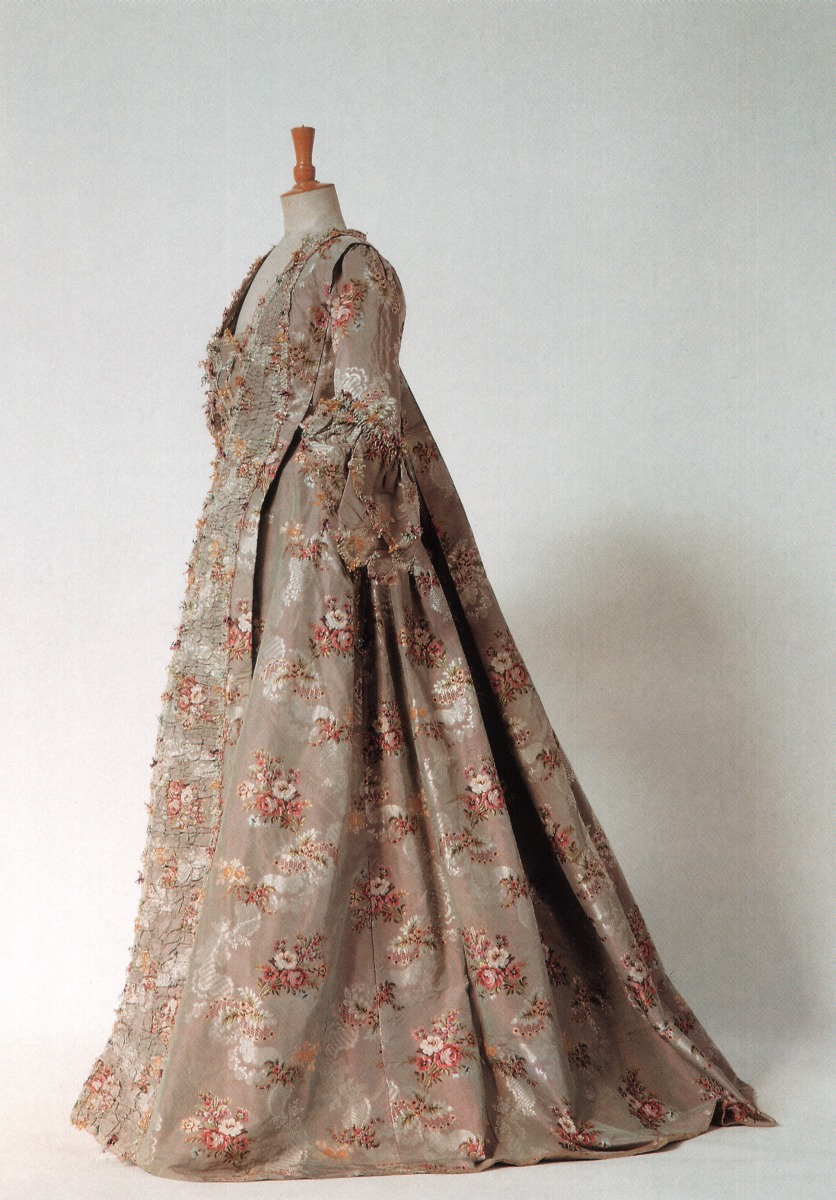 ROBE XVIIIe siècle à la Watteau en soie bleue brochée de rinceaux argentés et de bouquets. Jupe et parmenture garnies de frivolités dans le ton.