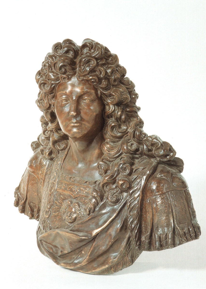 Important BUSTE en bronze patiné et ciselé représentant Louis XIV en armure, l'épaule gauche drapée.