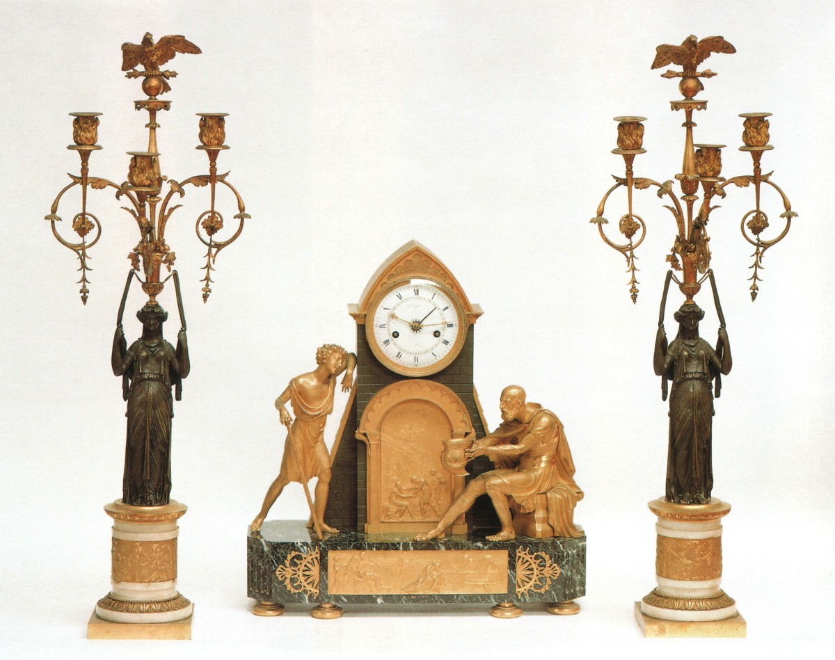 PENDULE DE RIEUFSEC à Paris en marbre vert, bronze ciselé et doré, et bronze à patine verte.