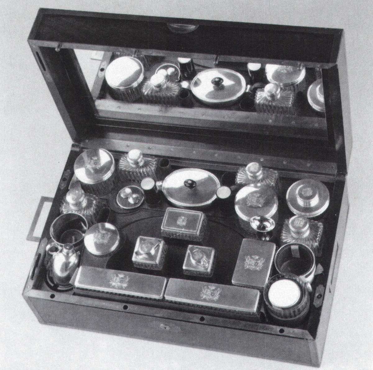 Quatre flacons à eau de toilette, trois boîtes à poudre ou à fard, deux boîtes à brosses et une boîte à savon, deux flacons piriformes en cristal blanc uni ou cannelé, les cols, couvercles et bouchons, comme une théière de forme ovale, une œillère et un petit crémier cylindrique, en argent, sur lesquels il n'y a aucun poinçon; deux couverts de table et deux cuillères à café, travail de Puiforcat, exécuté postérieurement à 1838. Les couteaux sont signés « Gavet coutelier du Roy».