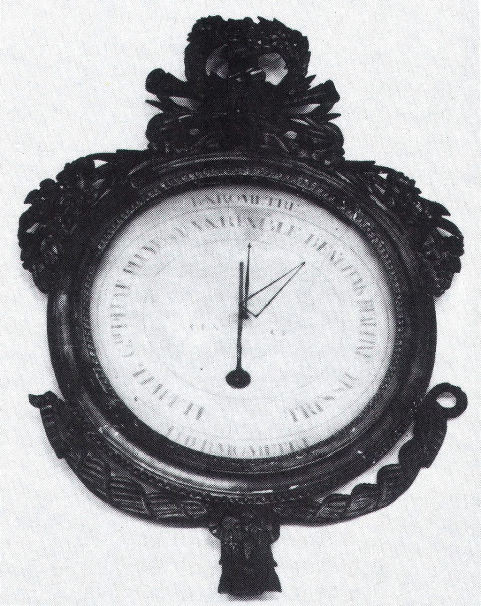 BAROMÈTRE-THERMOMÈTRE en bois sculpté et redoré à décor iconographique de la fin du XVIIIe siècle: draperies, nœud, fleurettes, couronne de fleurs et attributs de la musique.